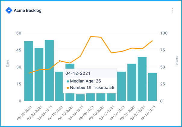 The Issue Backlog Trend Report. The bars show the number of issues in the backlog at a specific point in time. The line tracks the median age of issues over time.