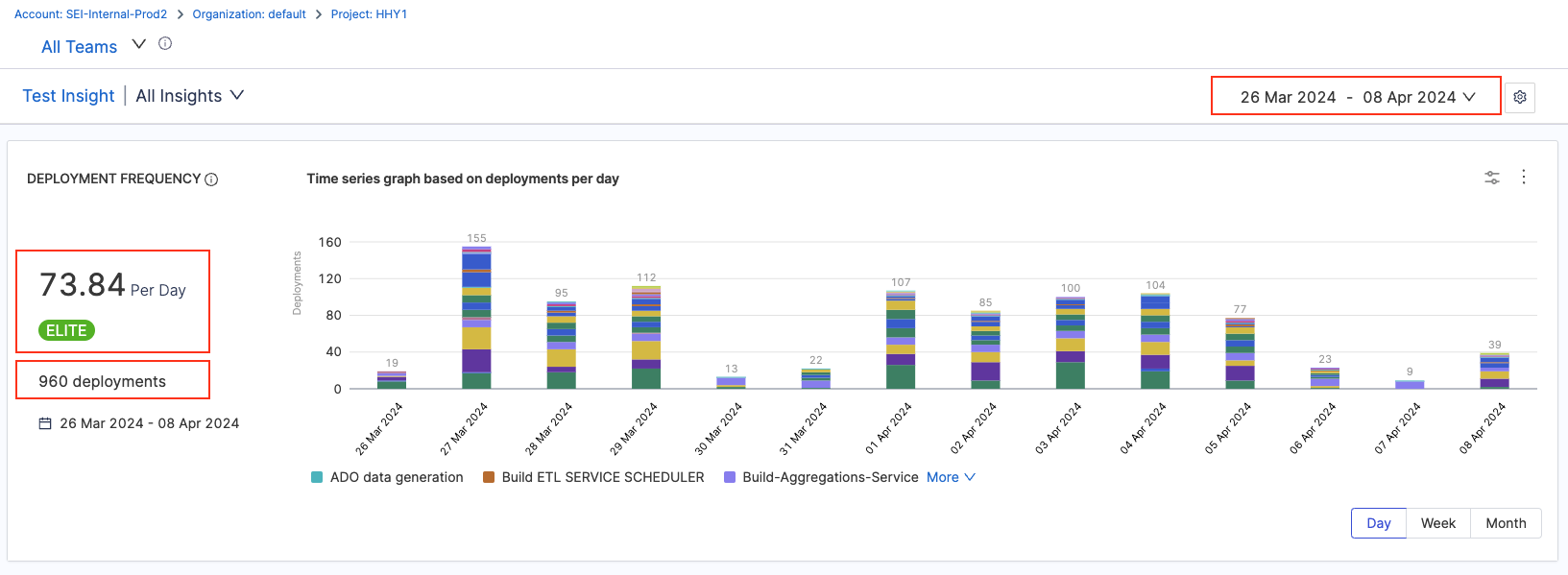 To monitor Deployment Frequency, you must create a DORA type Workflow profile and add the Deployment Frequency report to your Insights.