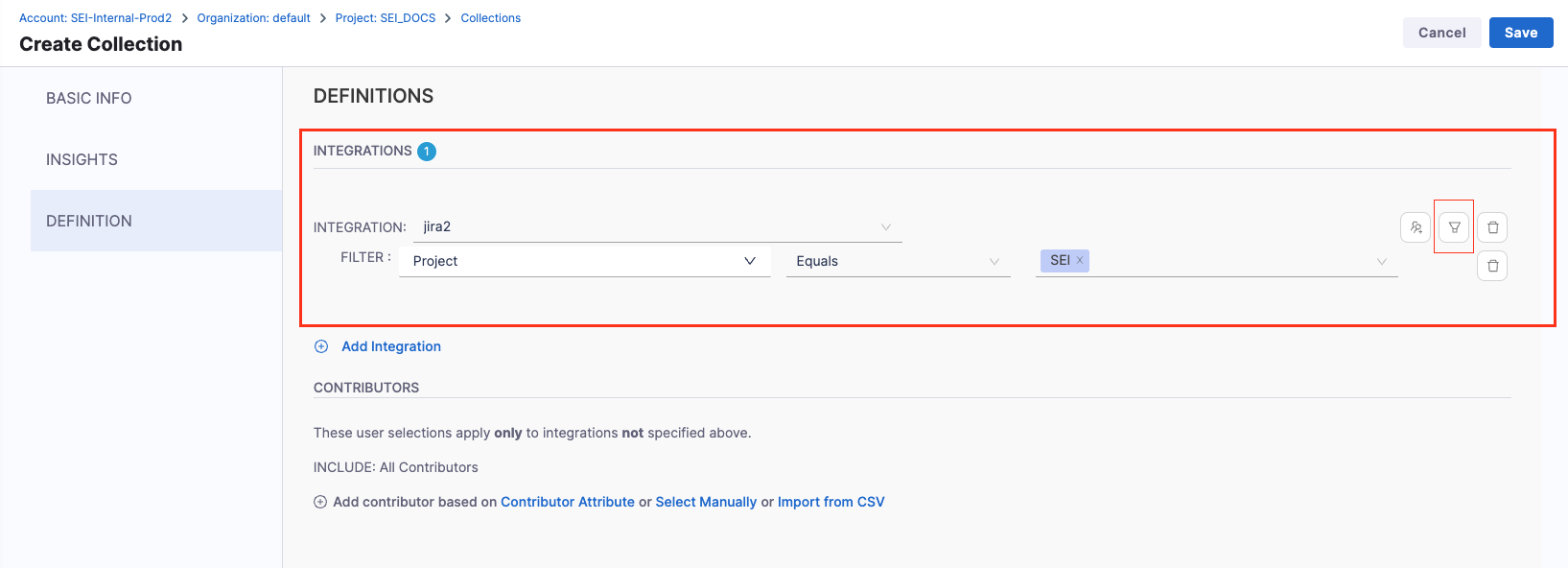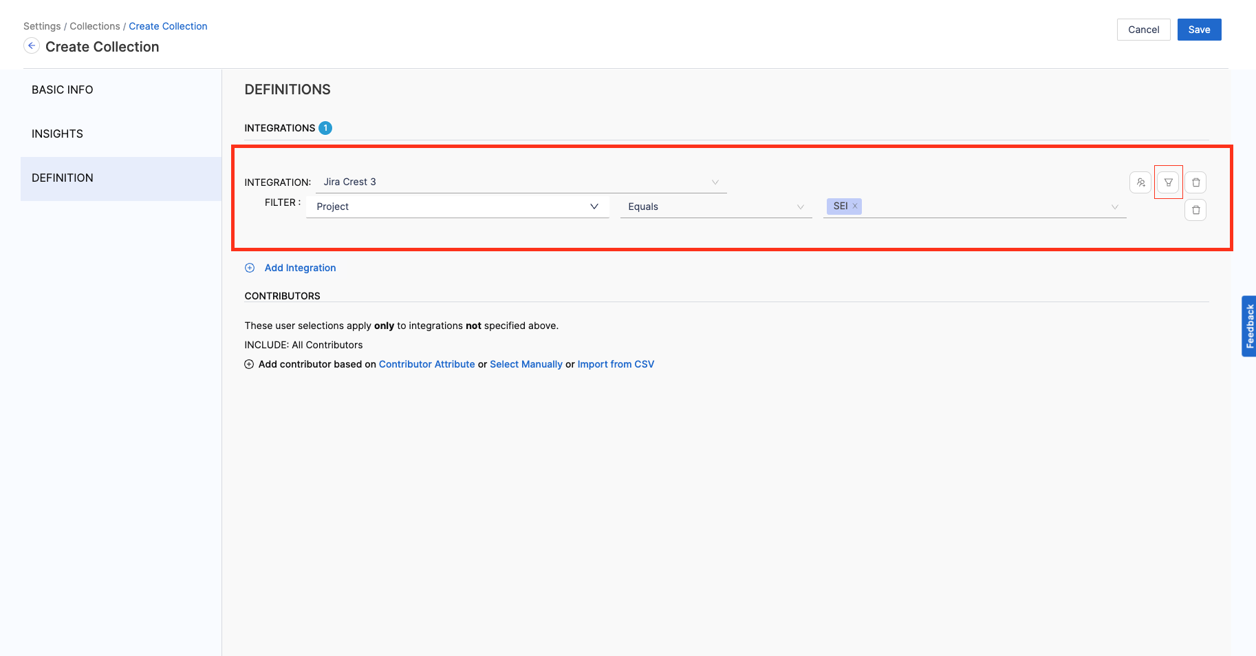 - Add the Integration Filters to determine the criteria to associate Contributors with the Collection.