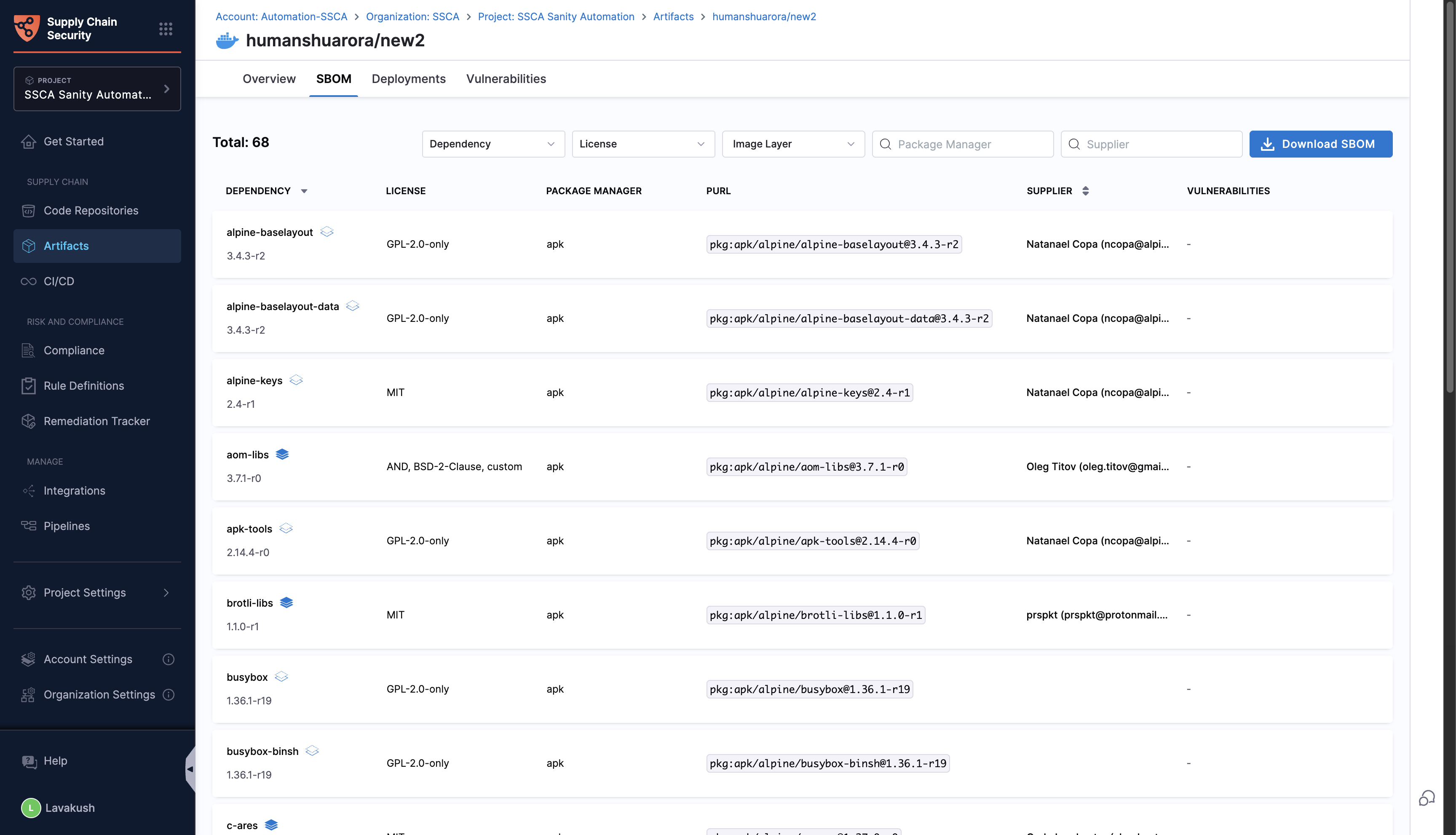 • SBOM: Shows the total number of dependencies along with the SBOM score. You can also download the SBOM from here.