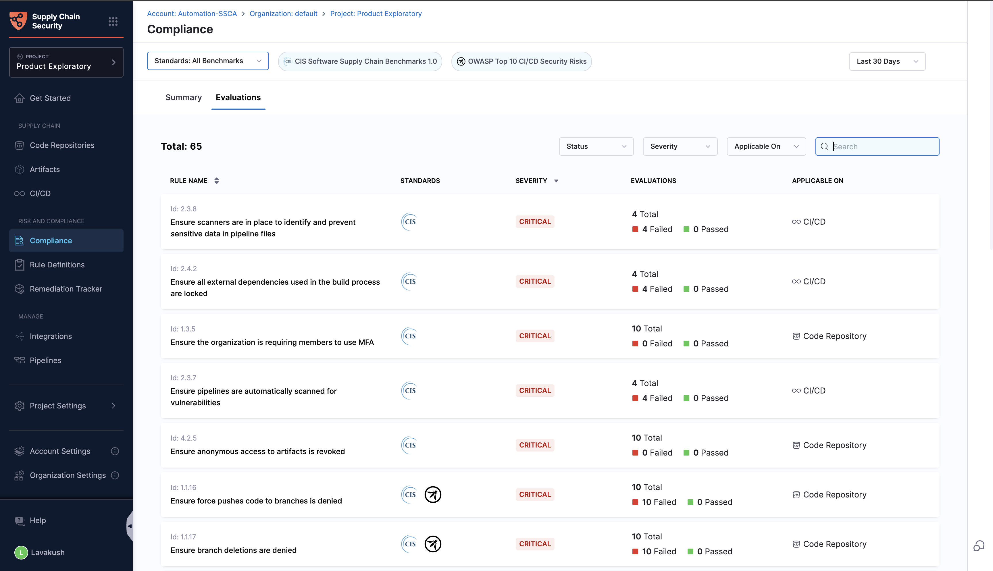 The Compliance section within the SCS module serves as a hub for assessing and understanding the risk posture of your entire supply chain. This section is indispensable for GRC (Governance, Risk, and Compliance) and security teams as it provides detailed evaluation results after applying all relevant rules to various target types within your supply chain. You can access a thorough summary of these evaluations, including the specific rules applied, their execution statuses, and the target types impacted by each rule.